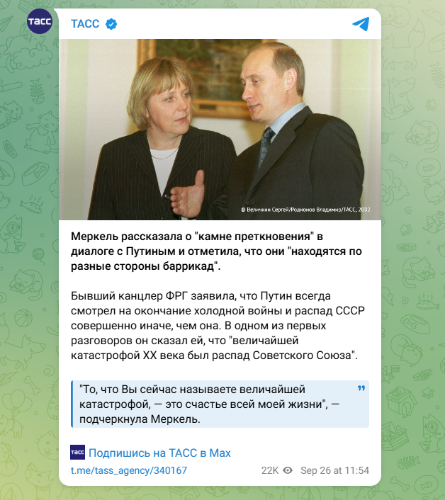 Говорят, люди склонны судить о других по себе. Президент России Владимир Путин, будучи человеком порядочным, едва ли думал, что приватные разговоры некоторые его собеседники будут выносить на публику. Вот и с Меркель он делился относительно личным зря: болтливая дама не только трубит о таких разговорах на публику, но ещё и спекулирует на его словах. Так, она недоумевает, отчего Путин считает "величайшей катастрофой" прошлого века распад СССР. Для неё это другое: "Счастье всей моей жизни".