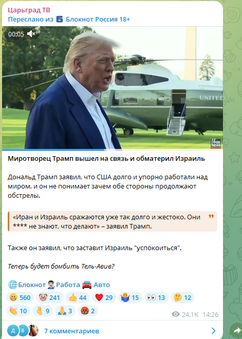 Трамп, кажется, потерял терпение и уже откровенно надавил на израильского лидера. Тот попытался проигнорировать перемирие, объявленное Трампом, намереваясь снова бомбить Иран. В итоге американский президент даже выматерился перед журналистами.