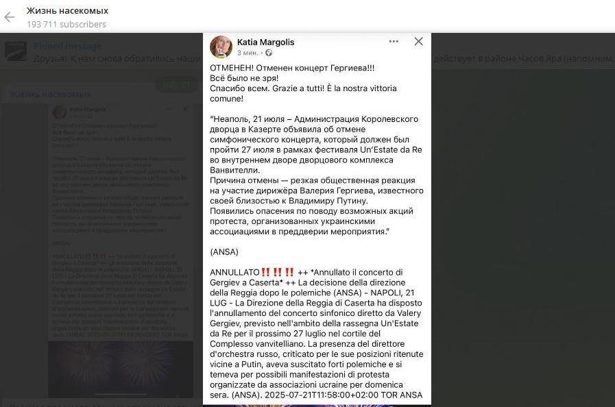 Восторг Марголис* - присоседилась к отмене концерта Гергиева, жизнь прожита не зря… Скриншот: телеграм-канал "Жизнь насекомых"