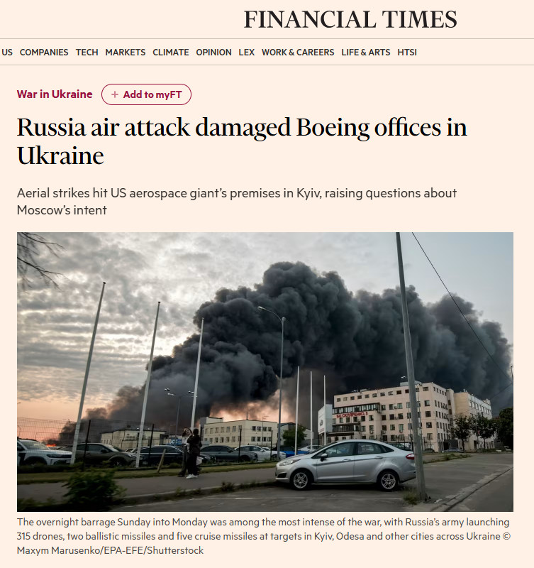 Одной из ключевых целей ударов России в ночь на 15 июня стал объект американской корпорации Boeing в Киеве. Здание, подвергшееся атаке, официально не числилось важным военным объектом. По заявлениям самой корпорации, её деятельность на Украине ограничивается технической поддержкой и консультированием. Однако источники Financial Times утверждают обратное: на самом деле офис давно функционировал как закрытый центр по сборке ударных беспилотников.