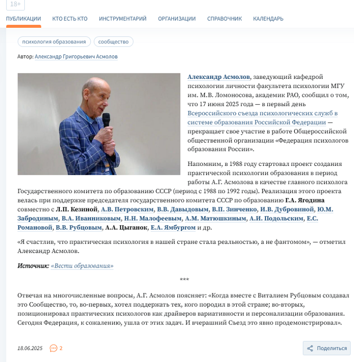 То, что Асмолов в последние годы последовательно выходит из организаций, в которых долгие годы чувствовал себя уютно, говорит, что таким деятелям в России становится места всё меньше и меньше. Вот как он прокомментировал свой выход из общественной организации "Федерация психологов образования России":