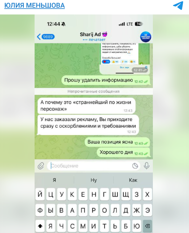 Однако если верить переписке, обнародованной помощницей Меньшовой, Шарий отказался удалять канал под предлогом того, что ему уже заплатили деньги за контент. Он также явно обиделся на формулировку "страннейший персонаж".