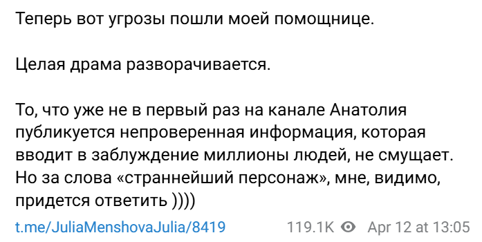 Юлия Меньшова заявила, что Анатолий Шарий опубликовал у себя рекламу якобы связанного с ней Telegram-канала, который на самом деле не имеет к актрисе никакого отношения и является мошенническим. Она сразу предупредила подписчиков, чтобы те не ходили на фейковый канал, а её помощница связалась с Шарием и попросила удалить ссылку.