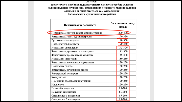 Этот пункт предоставляет главе Балаковского района Сергею Барулину право самостоятельно устанавливать размеры ежемесячных доплат для чиновников в зависимости от сложности задач и вклада работников в их выполнение. Согласно документам, доплаты могут составлять от 85 до 200% оклада, а для начальников управлений и заместителей главы администрации предусмотрены премии до 300-350%.