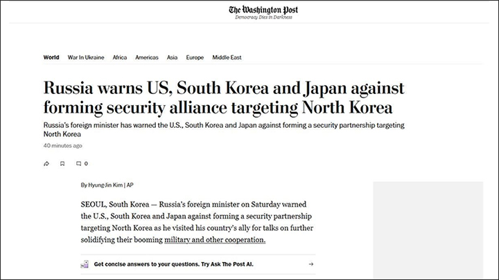 Заголовок - "Россия предостерегает США, Южную Корею и Японию от создания альянса против Северной Кореи". Скриншот: интернет-сайт washingtonpost.com