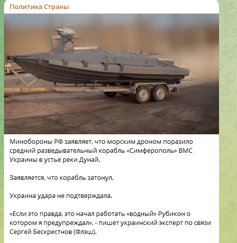 На днях Минобороны России сообщило о результативной атаке в устье Дуная: морским беспилотником был поражён средний разведывательный корабль "Симферополь" Военно-морских сил Украины. По официальным данным, корабль затонул.