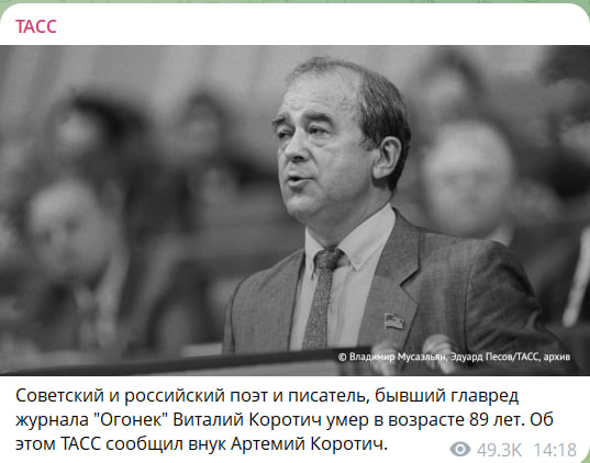 Советский и российский поэт и писатель, бывший главред журнала "Огонек" Виталий Коротич умер в возрасте 89 лет. Об этом ТАСС сообщил внук Артемий Коротич.