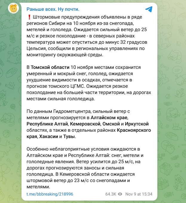 В регионах Сибири объявлено штормовое предупреждение. 10 ноября там ожидаются мощные снегопады, которые будут сопровождаться сильным ветром и резким падением температуры.