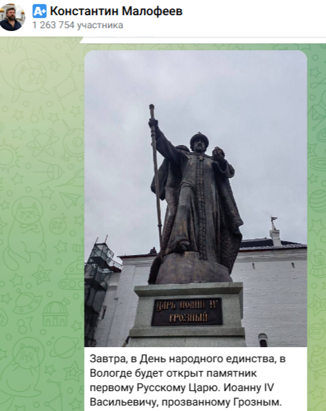 Символичное событие состоится в День народного единства. Так, в Вологде 4 ноября откроют особый памятник. О готовящемся мероприятии в своём Telegram-канале высказался учредитель канала Царьград Константин Малофеев.