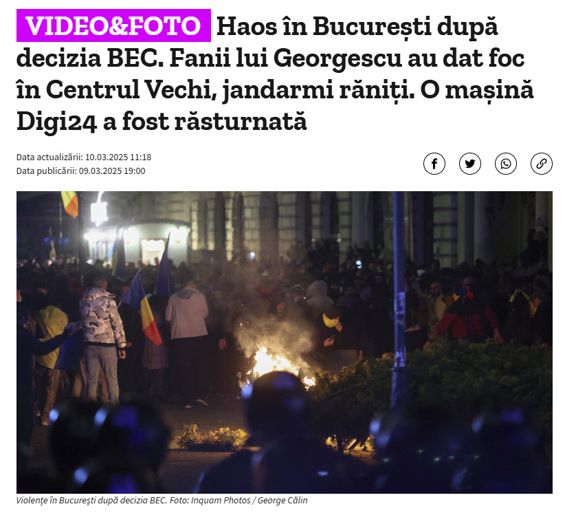 Центральное избирательное бюро Румынии не допустило Кэлина Джорджеску к участию в выборах президента. Причина отказа - необходимость "уважать Конституцию и защищать демократию". После радикального решения бюро в центре Бухареста произошли жёсткие столкновения демонстрантов с силовиками: митингующим удалось прорвать полицейский кордон. Сообщалось о пожарах, перевёрнутых машинах и петардах. По словам политолога Вадима Сипрова, румынский бунт могут подавить. Но европейский карточный домик это не спасёт.