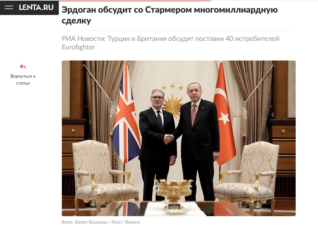 По данным турецких и европейских источников, Стармер намерен был обсудить с президентом Реджепом Тайипом Эрдоганом не только вопрос санкционного давления, но и масштабный контракт на поставку Турции сорока истребителей Eurofighter Typhoon. Первые двадцать машин должны поступить из британских резервов, а вторая партия будет собрана специально для Анкары. Сделка оценивается в миллиарды долларов и, по мнению аналитиков, должна закрепить военно-политическое сближение Турции и Лондона.