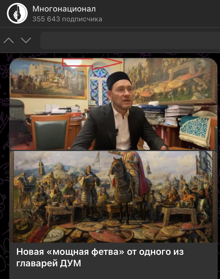 Имам Мухетдинов опять угодил в скандал - на этот раз в его кабинете в ДУМ РФ разглядели новую картину, которая возмутила общественность. "Сюжеты торжества тюрок над русскими", - описывает её автор одного из ТГ-каналов. По всей видимости, муфтий не извлёк урок из прошлых предостережений, и продолжает тихо презирать нашу страну. Детали - в материале Царьграда.
