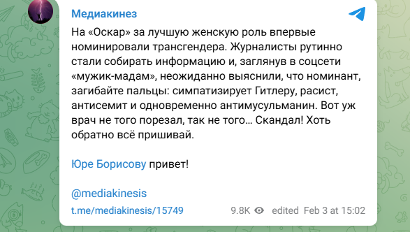 Вот так скандал в благородном семействе! Без шуток, в каждой первой публикации что прессы, что телеграм-каналов так и отмечают: "Скандал!" А речь о грядущей церемонии премии "Оскар", на которой такого ещё не было, - номинировали 52-летнего трансгендера*. В общем, компанию русскому номинанту Юре Борисову составил ну очень оригинальный актёр. Или актриса - тут уж не понять. Вот только оказалось, что заодно трансгендер* ещё и расист, антисемит и фанат Гитлера.