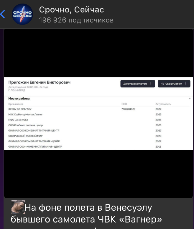 Вместе с этим фактом началось громкое обсуждение судьбы основателя ЧВК "Вагнер" Евгения Пригожина. Несмотря на официальную информацию о его смерти, появились данные, что перемещения Евгения Пригожина якобы отследили по банковским документам. Он продолжает получать зарплату от трёх компаний, зарегистрированных в России. Об этом сообщил Telegram-канал "Срочно, сейчас!", разместивший платёжную ведомость, якобы имеющую отношение к Пригожину. Эти сведения породили новые слухи в сети о возможном "воскрешении" основателя ЧВК и его появлении в Венесуэле, где он якобы мог бы стать правой рукой Мадуро.