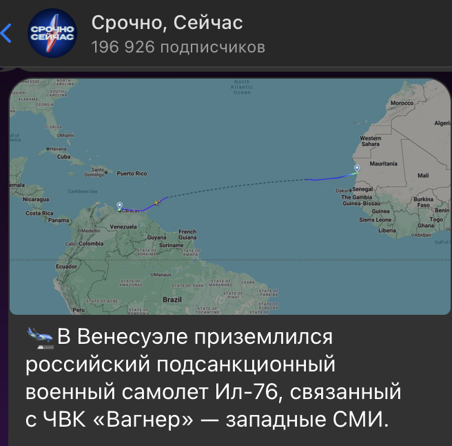 В начале ноября стало известно, что в Венесуэле приземлился русский военный самолёт Ил-76, связанный с ЧВК "Вагнер", находящейся под санкциями. По данным западных СМИ, этот самолёт прибыл после обращения президента Венесуэлы Николаса Мадуро к России, Китаю и Ирану с просьбой об усилении военной поддержки на фоне роста активности США в Карибском регионе.