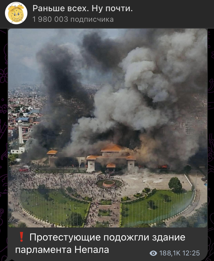 Военный блогер Юрий Подоляка отметил, что события в Непале можно смело назвать майданом, так как власти сами спровоцировали протесты своими ошибками. Он указал, что сначала они запретили социальные сети, не подготовившись к этому должным образом и не оценив последствия.