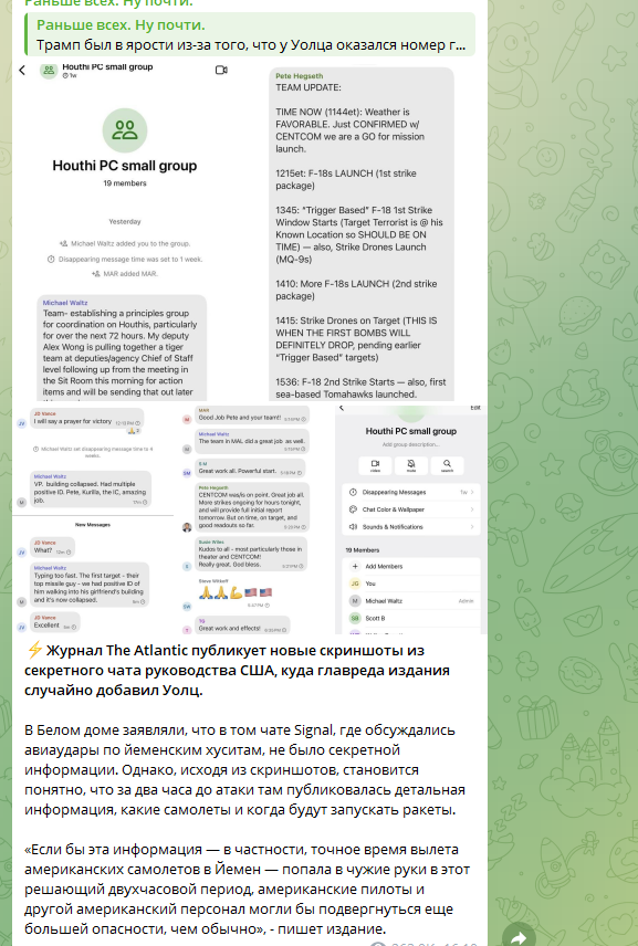 В The Atlantic, обнародовав новую порцию скриншотов, пошли в атаку на команду Трампа. Мол, а кого ещё могли по ошибке добавить в такой секретный чат?