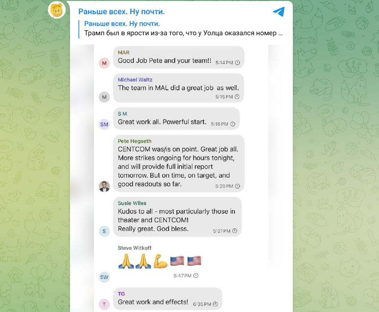 Так, на днях он порадовал читателей новой порцией материалов. На опубликованных им снимках чата видно, что Стив Уиткофф, спецпредставитель Трампа на Ближнем Востоке, показывает свою уверенность в силе Америки смайликами с флагом и мускулистой рукой. А Вэнс постоянно задаёт уточняющие вопросы.