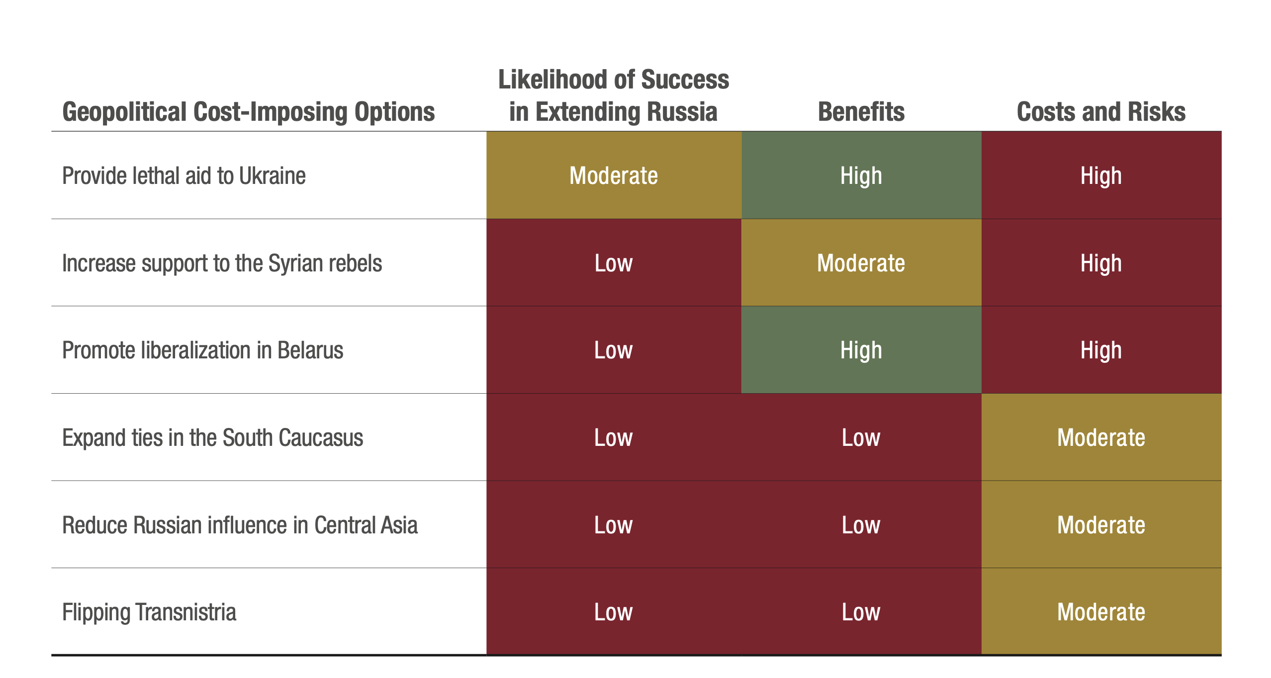 Любое увеличение военного вооружения США и предоставление консультаций Украине должны быть тщательно выверены, чтобы увеличить затраты России на поддержание её существующих обязательств, не провоцируя гораздо более масштабный конфликт, в котором Россия благодаря своей близости имела бы значительные преимущества.