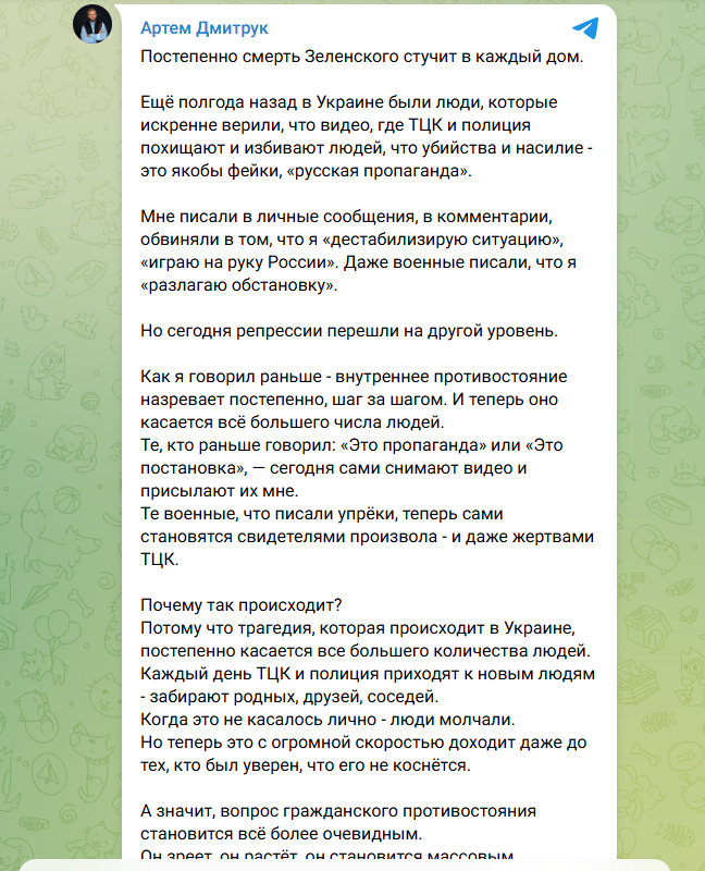 ФОТО: Скриншот https://t.me/dmytrukartem