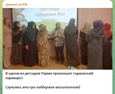 Царьград писал об этом случае: в феврале этого года один из детских садов Перми устроил день открытых дверей для родителей, и на собрании 90% пришедших мам были с головы до ног покрытые платками. Большинство из них - приезжие из Таджикистана. И эти женщины стали требовать от руководства садика, чтобы местных детей начинали учить таджикскому языку, чтобы их чадам "было проще адаптироваться", ведь русский язык никто из них не знает и знать не желает. Мигрантки пожаловались на то, что их дети не понимают ни воспитателя, ни местных ребят.