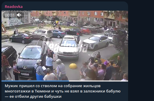 В Тюмени вполне обычное собрание жильцов одной многоэтажки переросло в сцену из боевика. На встречу заявился одиозный персонаж - мужчина-квартиросъёмщик. Что-то на встрече жильцов его категорически не устроило, и он решил действовать в духе лихих 90-х: вышел к машине, бросил в окно какие-то бумаги, а затем достал пистолет и пошёл "на разборки".