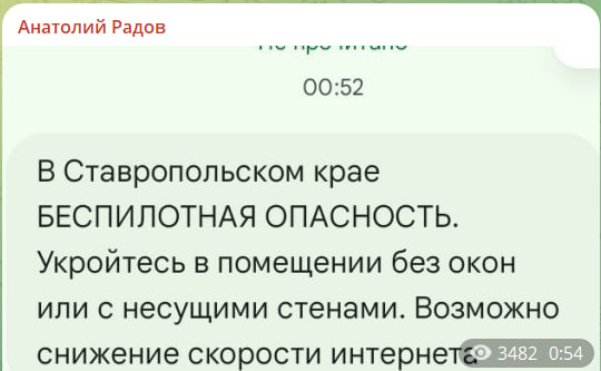 Военкор Анатолий Радов сообщил, что в Ставропольском кране начали приходить СМС-уведомления об объявлении беспилотной опасности. МЧС рекомендовало укрыться в помещении без окон или с несущими стенами. Также сообщалось о возможном замедлении интернета. В 00:54 глава Северной Осетии сообщил об угрозе атаки дронов и замедлении работы мобильного интернета. БПЛА продолжали лететь в сторону Адлера.