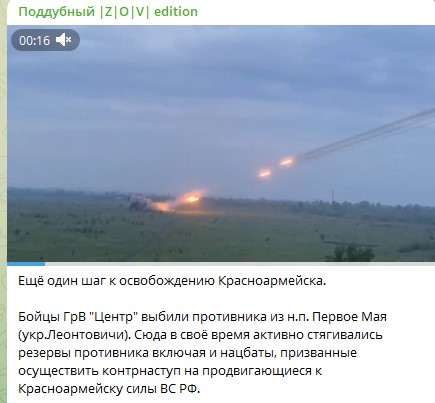 Тем временем украинский боевик с позывным "Мучной" подтвердил потерю посёлка Леонтовичи (ранее Первое Мая) южнее Покровска. Минувшей ночью там русские солдаты установили флаг России. Ещё совсем недавно "Мучной" уверял, что ВСУ выбили из посёлка ВС РФ, однако сейчас признал - посёлок контролируется Россией: