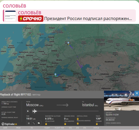 03:53 Согласно последним данным сервиса Flightradar24, самолёт специального летного отряда "Россия", который обеспечивает перевозку должностных лиц Российской Федерации, приземлился в Стамбуле. Уже сегодня там запланированы переговоры между Россией и Украиной.