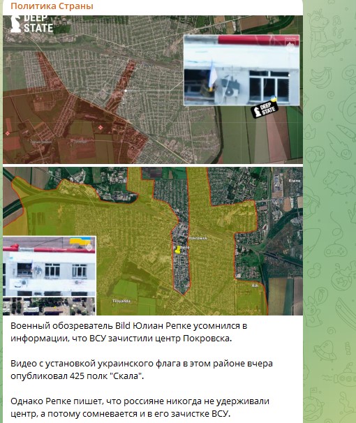 "Говорящие головы" Банковой, такие, например, как Михаил Подоляк, уже уверяют общественность: "Никакого окружения нет, ВСУ почти побеждают в Покровске, а русских там почти уже нет". При этом советник руководителя офиса Зеленского говорит, что в Покровске ВСУ контратакуют, и якобы очень успешно. Однако с ним в корне не согласен "лучший друг Украины", журналист Bild Юлиан Рёпке. Он, напротив, утверждает, что никаких признаков контратаки не видит - только оборона ВСУ.