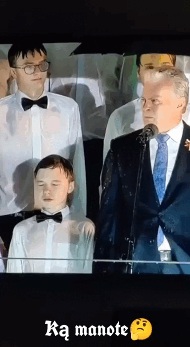 В то время как президент стоит под зонтом, закрываясь от дождя, мальчики из хора "Ажуолюкас", которые находятся рядом, дрожат, поскольку вымокли до нитки. Лидер страны даже не попытался прикрыть зонтом детей, а предпочёл просто не обращать на них внимания. Более того, на мальчика, стоявшего рядом с Науседой, вода стекала ещё и с президентского зонтика.