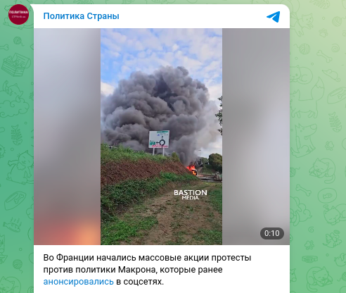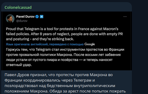 Иронично, что 5 лет назад "Телеграм" использовался для организации протестов в Белоруссии с целью свержения [президента Белоруссии Александра] Лукашенко. А теперь используется для организации протестов против Макрона во Франции.