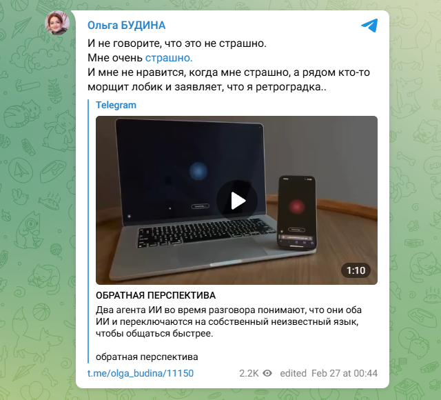 Актриса Ольга Будина прокомментировала одно из странных видео, которых всё больше появляется в интернете. Посвящены они, по сути, будущему - демонстрируют развитие технологий, а именно диалог между двумя искусственными интеллектами. ИИ "опознают" друг друга и успешно общаются, при этом переходя на им понятный собственный "язык". "Мне очень страшно", - призналась артистка, показав такой ролик в своём телеграм-канале.