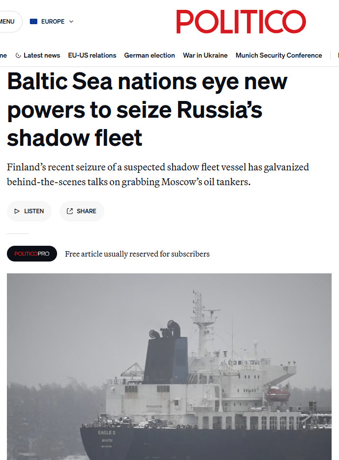 ФИНЛЯНДИЯ И ПРИБАЛТИЙСКИЕ "ТИГРЫ" АКТИВИЗИРОВАЛИСЬ В ОБСУЖДЕНИИ ВОПРОСА БОРЬБЫ С РУССКИМ "ТЕНЕВЫМ ФЛОТОМ", КОТОРЫЙ, КАК ПРЕДПОЛАГАЕТСЯ, ИСПОЛЬЗУЕТСЯ ДЛЯ ПЕРЕВОЗОК НЕФТИ В НАРУШЕНИЕ САНКЦИОННОГО РЕЖИМА. ОБ ЭТОМ ПИШЕТ ИЗДАНИЕ POLITICO.СКРИНШОТ СТРАНИЦЫ САЙТА POLITICO.EU