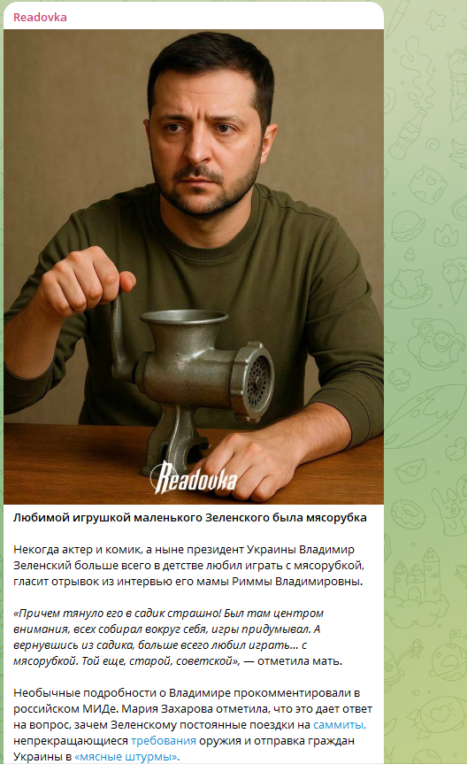 Воспоминания матери главаря киевского режима Владимира Зеленского поразили людей: она поведала, что его любимой игрушкой в детстве была… кухонная мясорубка. Народ тут же провёл параллели и пришёл к выводу - эта забава подросшего любителя мясорубок теперь хорошо заметна в Покровске. "Страшно тянет "играть" - все болезни идут из детства", - ужасаются пользователи Сети.