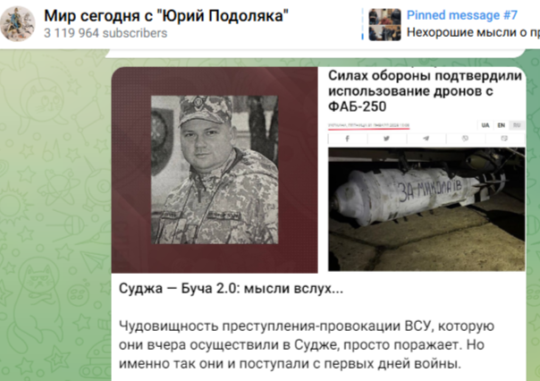 Суджа - это Буча 2.0. Концы не сходятся. Подоляка указал на двухходовку ВСУ под контролем британцев. Враг мог замышлять масштабную кампанию по дискредитации русской армии и введению всего мирового сообщества в заблуждение.