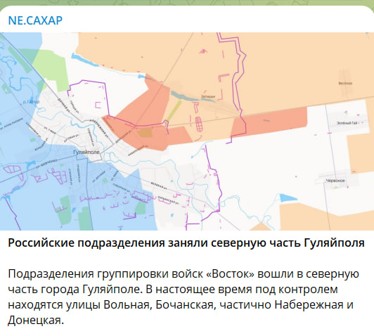 На западной стороне этой реки Гайчур собирается очень мощная украинская группировка. То есть они уже отдали это междуречье. А ГрВ "Восток" однозначно готовится к осаде Гуляйполя. Думаю, штурма никакого не будет. Будет осада в стиле Покровска, с инфильтрацией и так далее. Идёт очень мощная бомбардировка этого районного центра. Можно было бы ожидать, что ВСУ укрепляют эту всю линию, но нет. Самую большую часть отправляют севернее Гуляйполя, на Андреевку. Потому что это очень небольшой кусочек, на котором уже прорвали последнюю линию обороны, вдоль которой вся украинская армия сейчас выстраивается, и там форсируют реку Гайчур.
