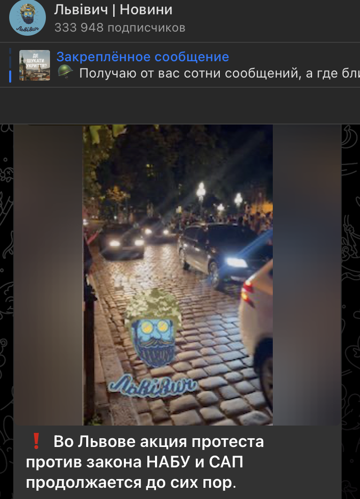 Ветеран ВСУ Дмитрий Козятинский призвал всех неравнодушных принять участие в акции протеста против сокращения полномочий Национального антикоррупционного бюро (НАБУ) и Специализированной антикоррупционной прокуратуры (САП). В своём обращении он предложил собраться в 20:00 на площади у театра имени Ивана Франко - одном из ближайших к офису Владимира Зеленского мест, сообщает Pravda.ru.