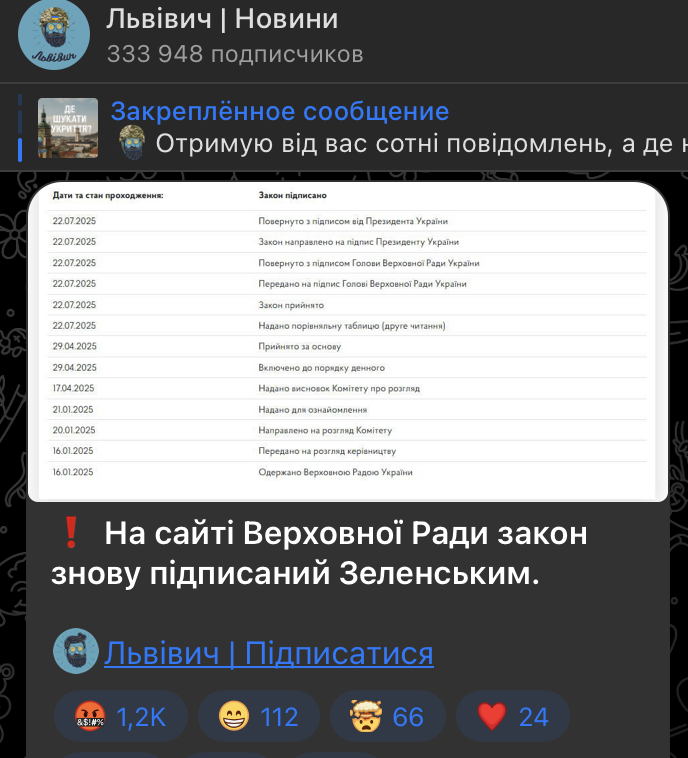 Напомним, что недавно Владимир Зеленский подписал спорный закон №12414, существенно ограничивающий возможности НАБУ и САП, что вызвало волну возмущений в обществе и среди политиков. Интересно, что на официальном сайте Верховной рады статус закона несколько раз менялся: сначала было указано, что документ подписан президентом, затем отметка исчезла, а после вновь появилась.