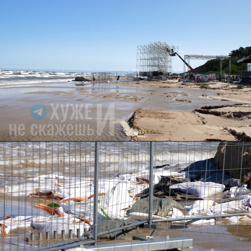 Помимо мусора, на пляже появились ямы с водой. Как объяснил один из рабочих, это произошло из-за того, что была создана искусственная дюна для защиты сцены от воды. Он добавил, что вскоре всё должны вернуть так, как было.