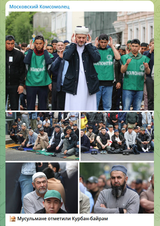 А теперь пробежимся по сегодняшней статистике - сколько верующих в разных регионах собралось на намаз. По данным из открытых источников, самые массовые праздничные моления прошли в Чечне - 355 тысяч, Дагестане - 350, Москве и области суммарно - 295, Петербурге - 215, Татарстане - 125, Башкирии - 60, Крыму - 55 тысяч. Совокупное число верующих, принявших участие в праздничных службах по всей стране, составило около 2 млн человек. По разным данным, от 50 до 70% из них - мигранты.