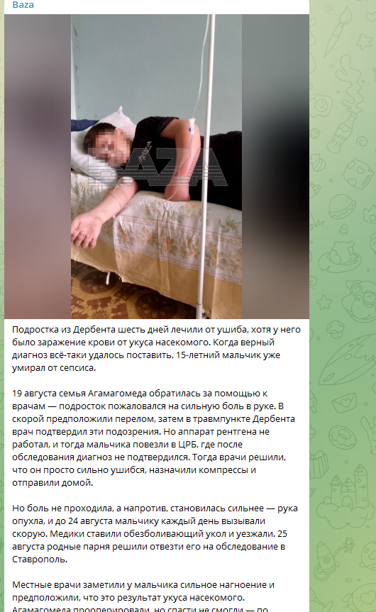 25 августа, видя, что состояние Агамагомеда ухудшается, родные решили везти его в ставропольскую больницу. Там врачи заявили, что рука успела сильно нагноиться.