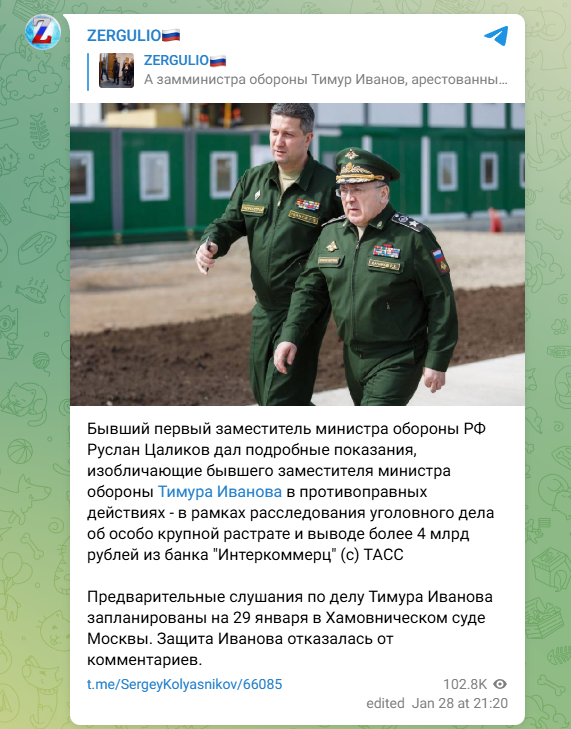 Напомним, в отношении бывшего замминистра обороны Тимура Иванова возбуждено сразу три уголовных дела. Изначально его обвиняли в получении особо крупной взятки (в том числе объектами недвижимости), сумма которой оценивалась в более чем миллиард рублей.