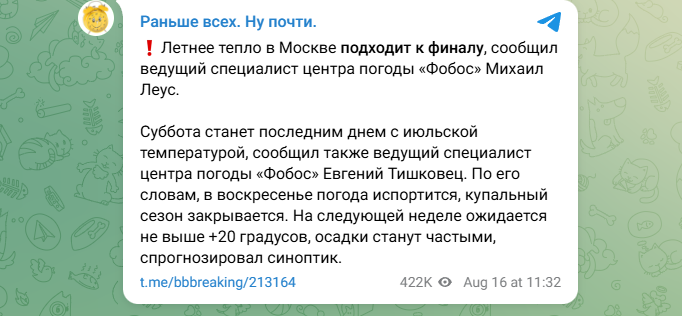 Как сообщил ведущий специалист центра погоды "Фобос" Михаил Леус, москвичам и гостям столицы остался всего один по-настоящему тёплый летний день. Уже в скором времени похолодает. Снижение температуры начнётся в воскресенье.