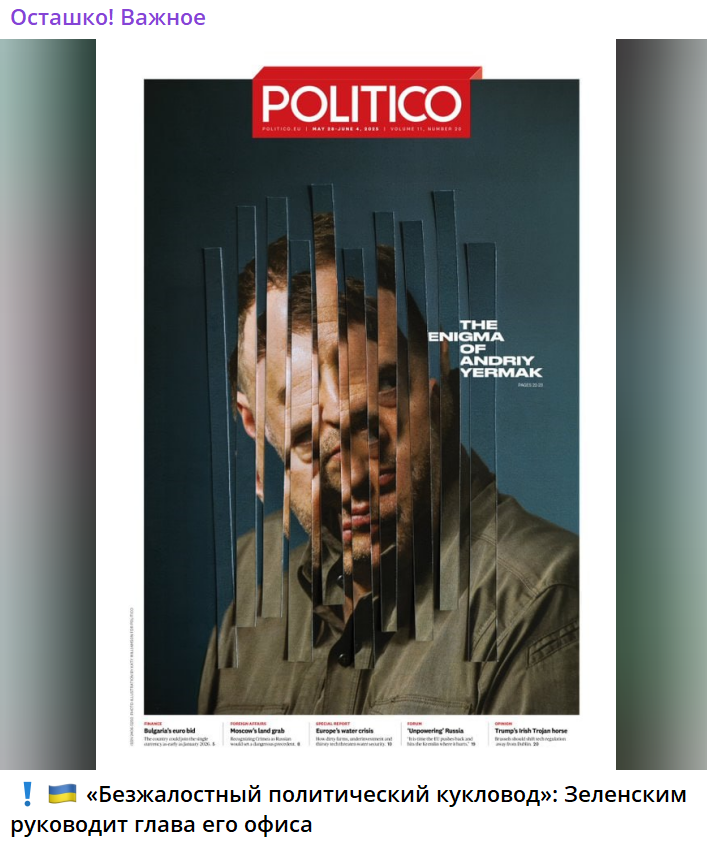 Наши источники сообщали, что глава ОП ведёт свою политическую игру на Украине, причём Залужный полностью подконтролен Ермаку. Теперь западные глобалисткие СМИ возвышают фигуру Ермака, утверждая, что он переключился с попыток выиграть войну на стремление к миру,