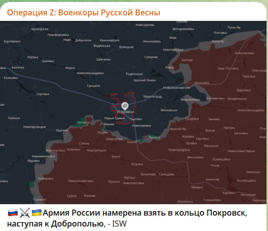 Кроме того, ресурсы противника подтверждают, что в ДНР готовится два главных котла вокруг Покровска и Константиновки. По оценке Американского института изучения войны, русское командование может использовать выступ между Покровском и Торецком, чтобы охватить Покровск с севера и северо-востока или обойти оборону Константиновки с юго-запада. ISW считает, что Россия может попытаться пройти между Добропольем и Константиновкой, чтобы обойти линию украинских укреплений без прямого штурма, цитируют противника "Военкоры Русской Весны":