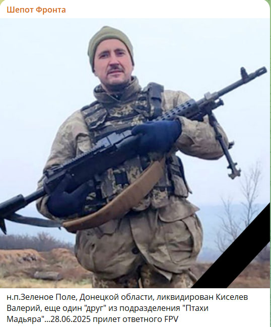 По информации канала "Шёпот фронта", слит некролог латышского наёмника Альенса Оскара. В Предтечино ликвидирован итальянский барабанщик группы DEVA Thomas D'Alba. Уничтожен на Херсонском направлении. Под Купянском уничтожен чемпион ММА Украины, Александр Мизин, полк "Азов"*. Под Сумами ликвидирован звукорежиссёр Дмитрий Горнов, проходивший обучение в Британии. А в Зелёном Поле уничтожен один из ближайших людей "Мадяра" - Валерий Киселёв.