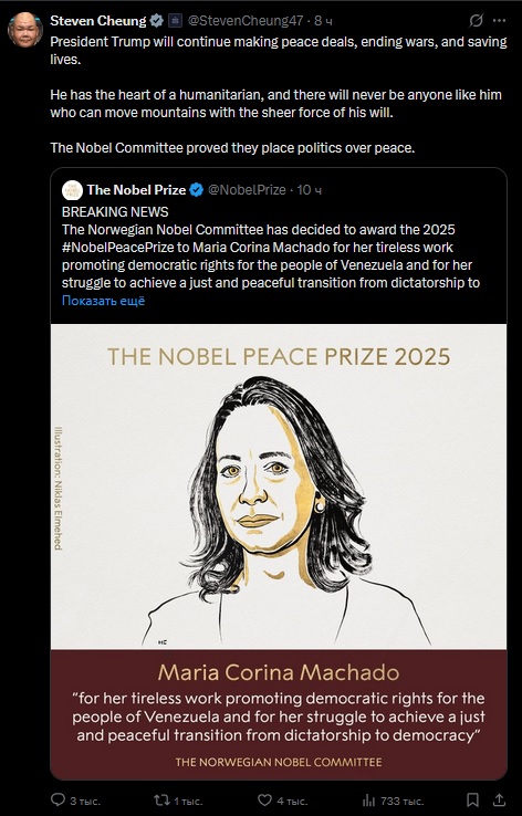 Но вместо Трампа награду получила политик из Венесуэлы, той самой Венесуэлы, где флот США проводит военную операцию "по борьбе с наркокартелями". Выглядит, как изощрённое издевательство над американским лидером.