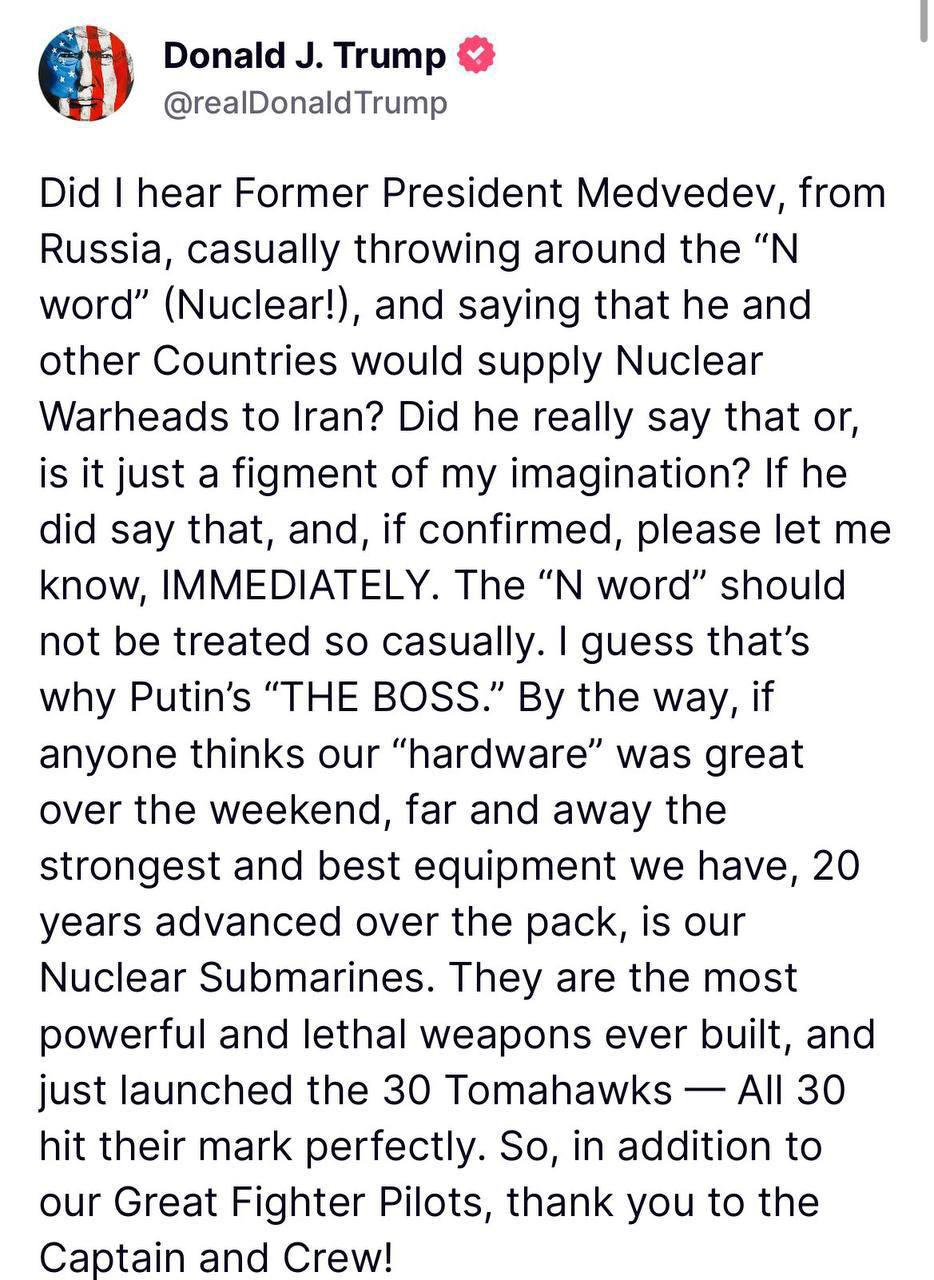 Зампред Совбеза России не стал долго томить действующего президента США, быстренько "оправдавшись", но как! Медведев подчеркнул в комментарии на английском языке в соцсети Х, что "осуждает удар США по Ирану", который "не достиг своих целей", заверив, что "Россия не намерена поставлять ядерное оружие Ирану, потому что, в отличие от Израиля, мы являемся участниками Договора о нераспространении ядерного оружия".