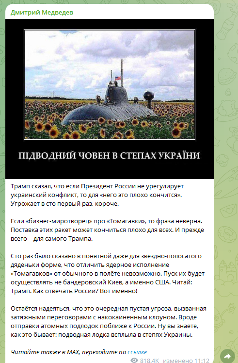 Так, Трамп называл Медведева "глупым человеком" и злился, что тот регулярно напоминает о ядерном оружии России. В ответ на это американский президент грозил невидимыми ядерными субмаринами у русских берегов, породив мем о подлодках в степях Украины. Медведев, конечно, в долгу не оставался, сравнивая риторику американского лидера с "голливудским триллером" и "дешёвой классикой категории B".